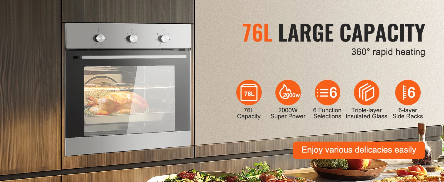 76L Large Capacity: The 76-liter large capacity design features 6 chrome-plated side racks for placing racks and baking trays. It includes a powerful convection cooking system that circulates hot air around the oven, above, below, and throughout, providing optimal temperature and airflow for quick preheating and even temperature control. This helps eliminate cold spots and ensures uniform baking, heating the entire oven interior to the correct temperature.